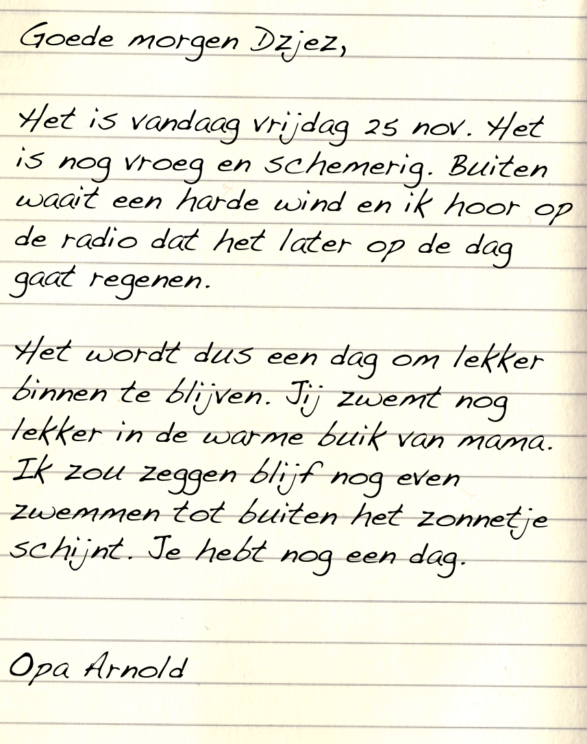 Gelukkig heb je op mij gewacht,erg lief,dus wat mij betreft mag je nu je entree maken, wij kijken allemaal heel erg uit naar je komst. Ik ben (net als iedereen) zo benieuwd hoe je er uit ziet,een kleine Gerard of meer mamma Jasja. ‘T is altijd goed hoor, ik houd nu al van je !!