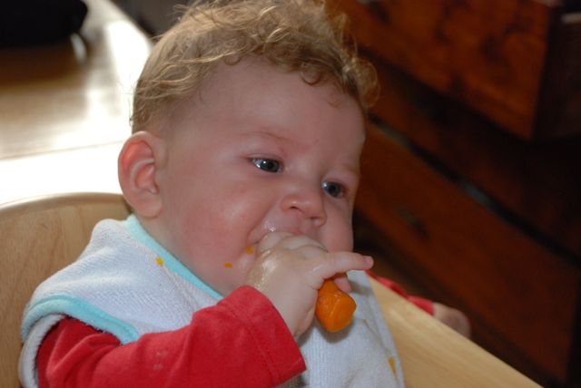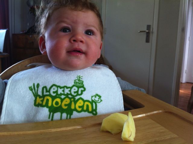Ik mocht in het wippertje in de keuken zitten terwijl papa en mama kookten en ik een appeltje opat. Ja ja, kauwen en slikken en niet stikken, ik kan het! Zo zie je maar; een paar dagen oefen en het gaat. Morgen weer en dan ook groente. Het was een mooie dag en morgen komen Siebe en Zelda. Heb ik ook al weer zin in! Maar nu eerst naar bed en een goed nachtje slapen (zegt papa….). We zullen zien!