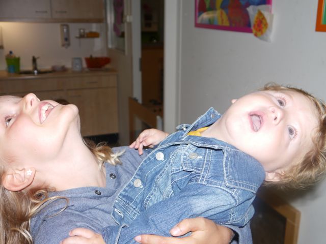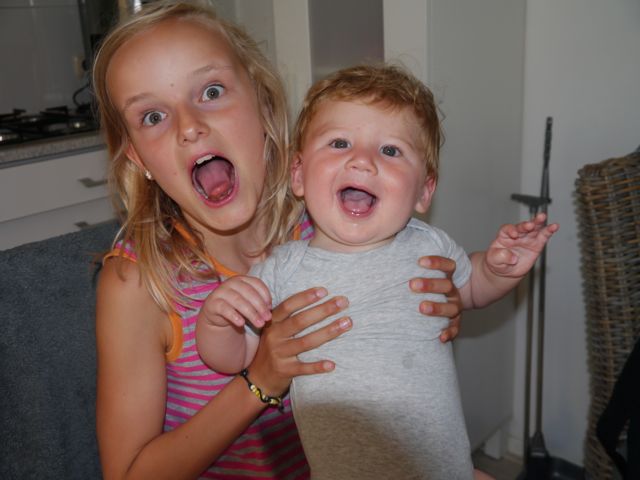 Ze hebben lekker gek gedaan toen ik op de creche was! Skip-Bo gespeeld en Siebe had kersen gegeten en er z’n lippen mee ingesmeerd. Zelda lacht dan weer hard en Siebe zet een boerka op… Grappig!