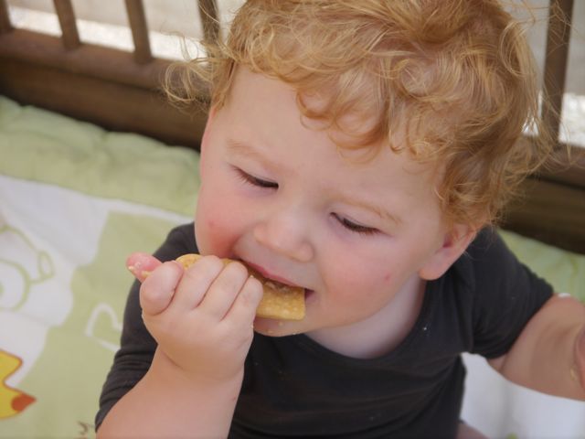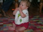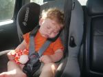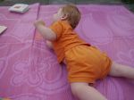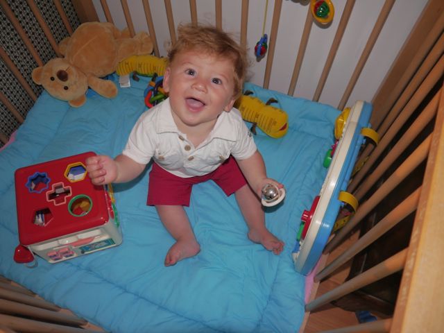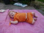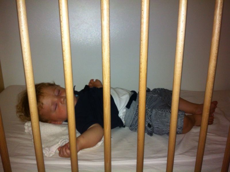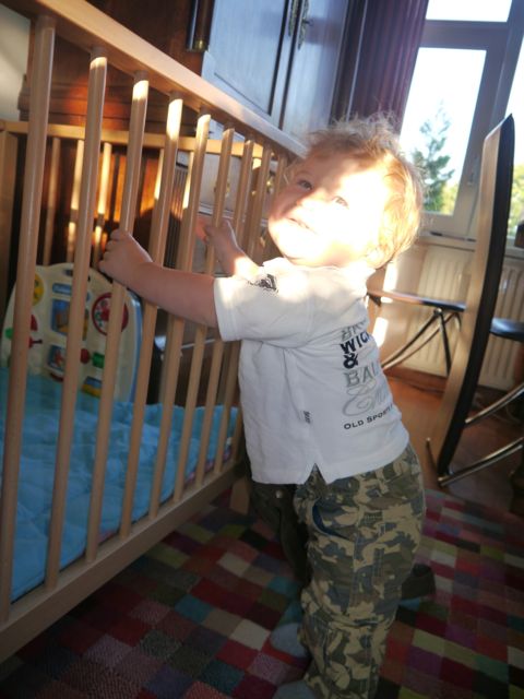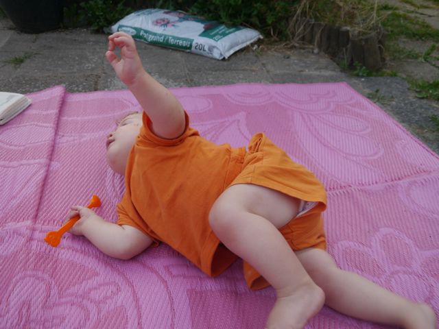 En goed eten (en spelen) doet goed slapen is dan weer een opvolger van de vorige. Uitgeteld in bed (en ik kan nog niet eens tellen!) en uitdrukkingsloos, want ik was in een diepe slaap verzonken. Op m’n rug en dat betekent dat ik moe was. En dat was wanneer mama me kwam halen en dat betekent Oost West Thuis Best! En daar krijg ik dan weer een blije uitdrukking van.