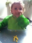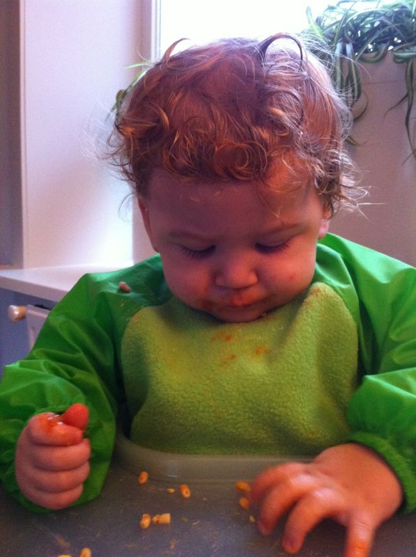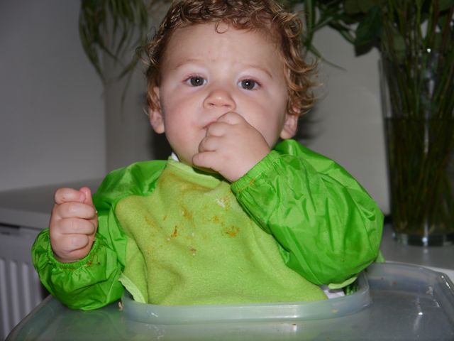 Ik heb ook wat gegeten, niet te veel, maar wel in m’n nieuwe groene mouwslabbetje. Dat kleurt goed bij m’n ogen en ik word nooit vies. M’n kleren niet, want ik heb gisteren gewoon m’n gezicht met spaghetti ingesmeerd. Dat kan dus ook.