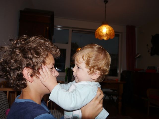 Dat kan natuurlijk ook speelgoed zijn, maar dat is minder aantrekkelijk. Nou, deze ochtend heb ik best lang in de box gezeten en met alles gespeeld wat daar was. Daar kan ik me ook heerlijk mee bezig houden. Ik was wel blij toen ik Siebe nog even zag. Even een broer-tot-broer-momentje. Ik was ook blij dat ik Zelda zag, maar daar heb ik geen foto van. Niet van deze ochtend.