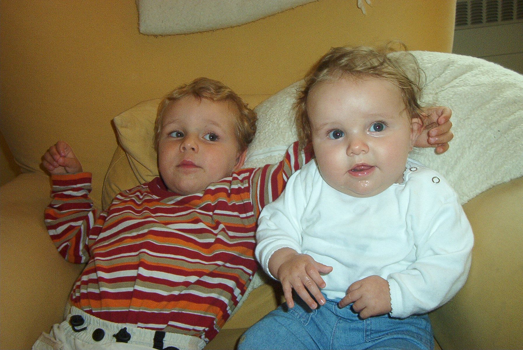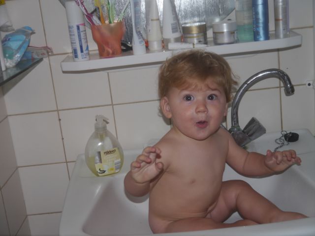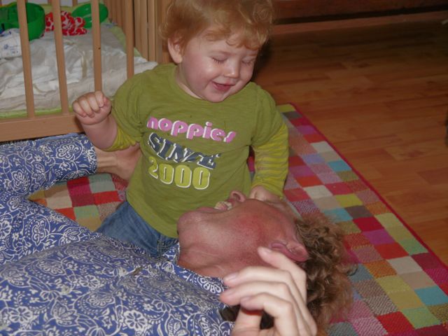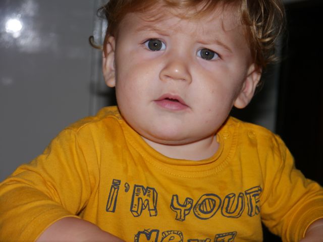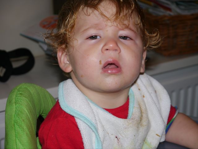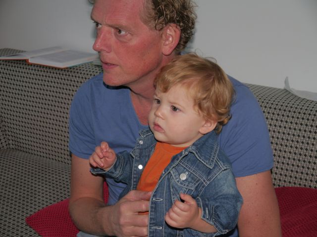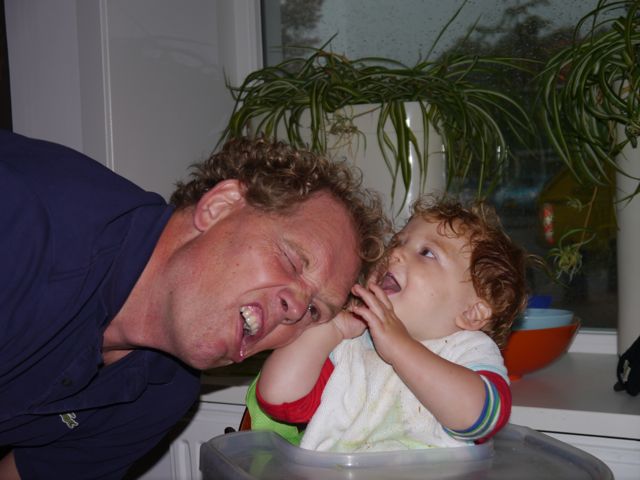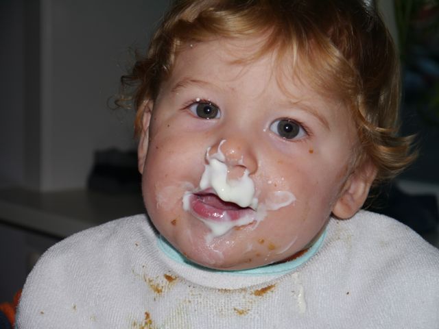 Altijd lachen met die man, hahaha! En ik noem hem papa (nou ja, in gedachten want echt uitspreken doe ik het nog niet). Lachen met pap en knuffelen met mama, dat doe ik graag. En als ik geen zin meer heb in yoghurt doe ik PFFRRTTT! En als de lepel dan in de weg zit, zit de yoghurt overal. Tot op de wimper van m’n oog! En dat heeft dan ook weer z’n charme. Zo gaan die dingen.