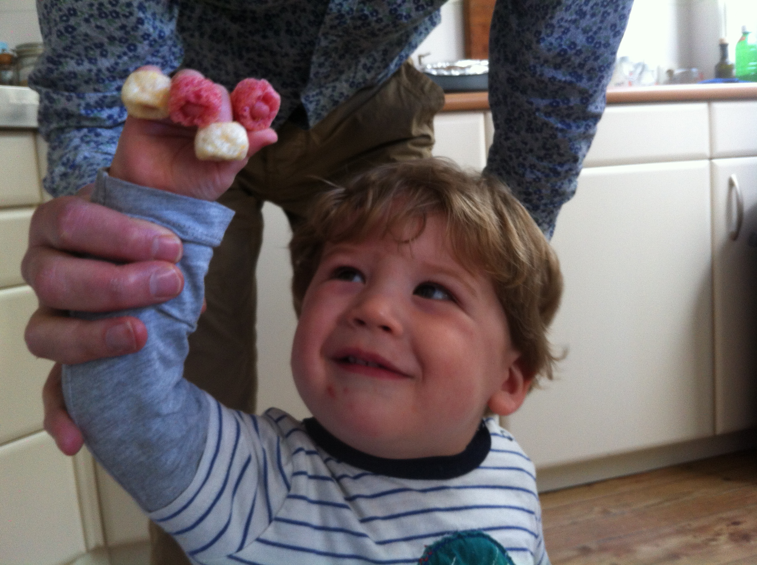 Het was een echte zondag deze maandag. Ik mocht chips eten en heel veel. Papa heeft zelfs nog chips om m’n vingers gedaan en dan kan ik die er af eten en dat is diedaktiesj verantwoord zegt hij. Goed voor de oog-mond-coördinatie.