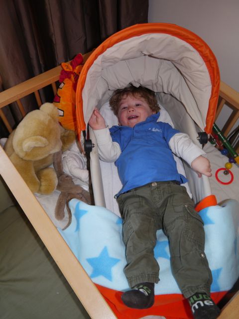 Ik dacht, eens kijken of ik in de wieg van Jay pas (met hulp van papa) en dat past best. Als het moet kan ik er een hele nacht in slapen. Stijf op m’n rug dan, want bewegen zit er niet in.