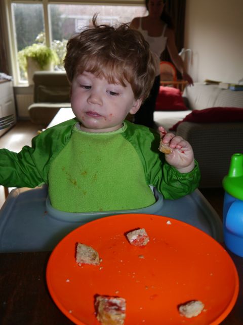 Ik heb lekker geknuffeld met mama, boekjes gelezen, (De Koning, één van m’n lievelings), Hopla gekeken en een pannenkoek gegeten. Daarna heb ik nog even Jay geaaid en toen naar bed! Lekker d’rin na een goed flesje! Zo gaan die dingen.