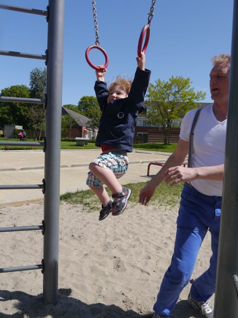 Ik heb ook aan de ringen gehangen. De eerste keer ging dat goed, maar toen Siebe er een foto van wilde nemen, duurde het hangen 1,6 seconden, daarna viel ik op de grond! Met een lach.