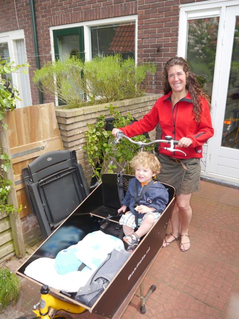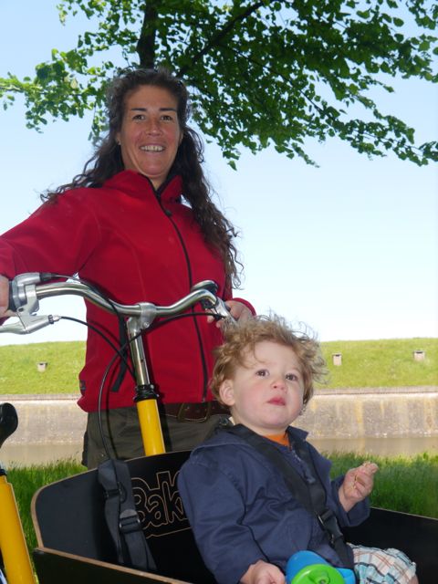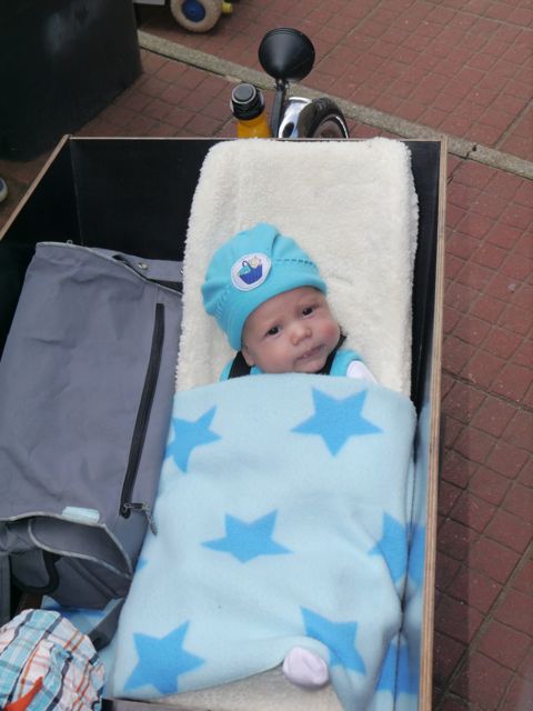 Toen Dzjez weer op was en eerst wel 3 kopjes soep en broodjes heeft gegeten, heeft mama me ingepakt in de nieuwe babyschelp in de bakfiets! Dzjez zat er toen al zeker 5 minuten in, geduldig te wachten op vertrek. Die had de hele dag al in z’n kop dat we gingen fietsen. Ik laat’em dan maar, want wie weet en ja!