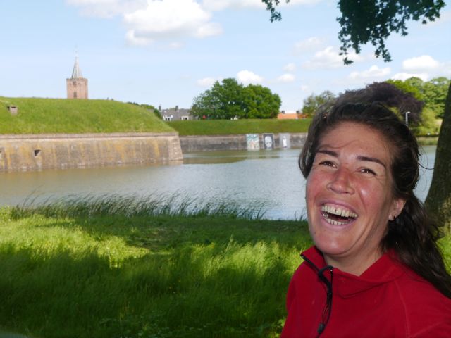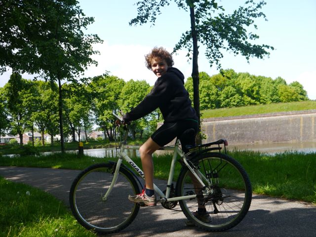 Bijna hadden we het niet gehaald en waren we achteruit de plomp ingereden, zo stijl was de wal van de vesting waar we tegen op moesten, maar mama heeft het vol vuur gered! Haar kuiten stonden in brand, maar wat ene kracht. Daarna zijn we over de ridder(fiets)paden om de vesting gaan fietsen. Siebe over de wallen en wij niet.