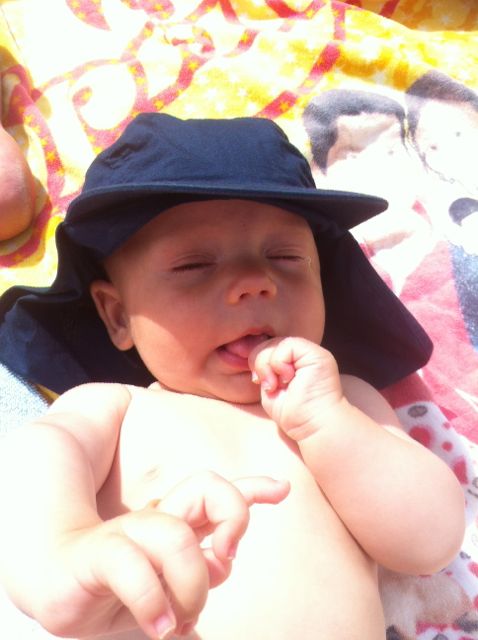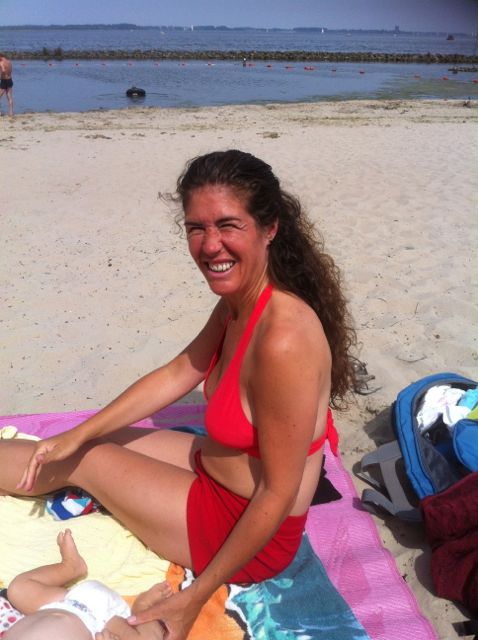 Ik wordt als een soort sportbaby op een sporttas met handdoeken en boeken naar het strand getransporteerd. Multifunctioneel. Daarna lig ik lekker in de zon (ingesmeerd mét zonnehoed, voor de Olma’s en Beppe’s) te genieten van de warmte.