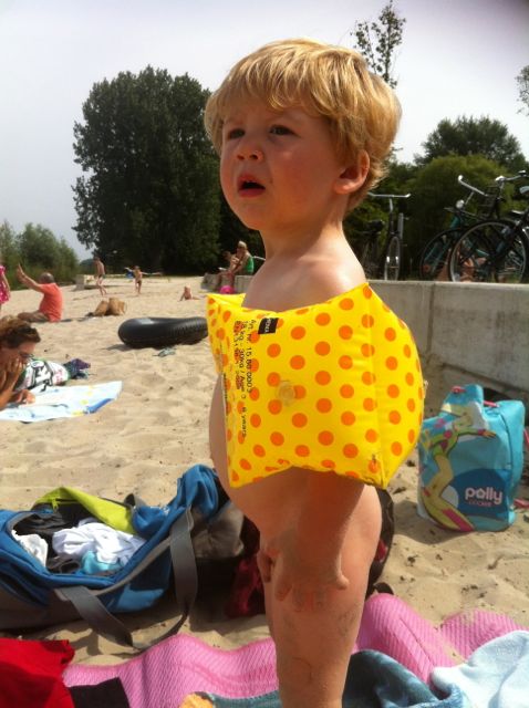 Na gezellig spelen met Zelda, mama en Jay en na mijn middagslaapje gingen we in de bakfiets naar het strand. Ons eigen strand op 7 minuten van ons huis. En daar sta ik dan. Naakt met zwembandjes en een onuitputtelijke ontdekkingsdrang. Ik wil alles zien, overal op en hoe verder hoe beter.