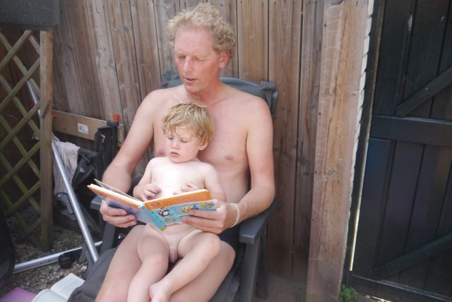 Ik had ook een aanloopje nodig om er lekker in te gaan zitten, maar gelukkig is papa daarvoor. Die spettert me dan nat en gaat er zelf ook in zitten en dan doe ik het ook.