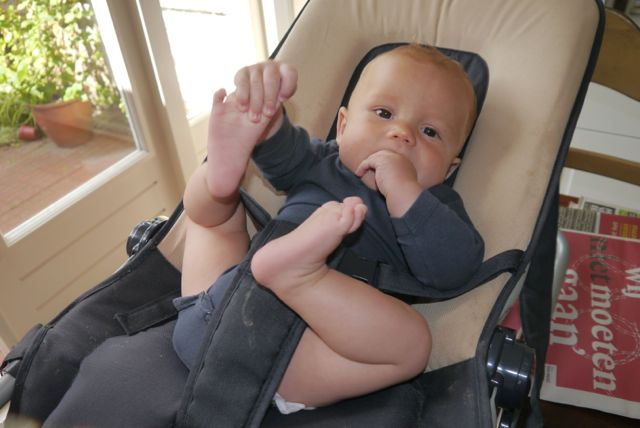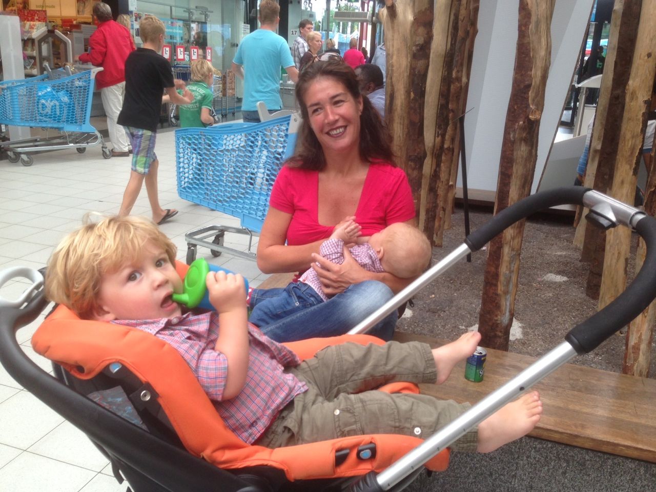 Ik probeer het nog een keer en deze keer… mislukt het weer! Weer is papa te snel en ga ik terug in de winkelwagen. Daar was ik eerder al bijna uitgevallen, toen ik dacht dat ik recht op kon staan. Gelukkig vin mama me op, met Jay in de arm, die een harde PIEP gaf, want die was rustig aan het drinken.