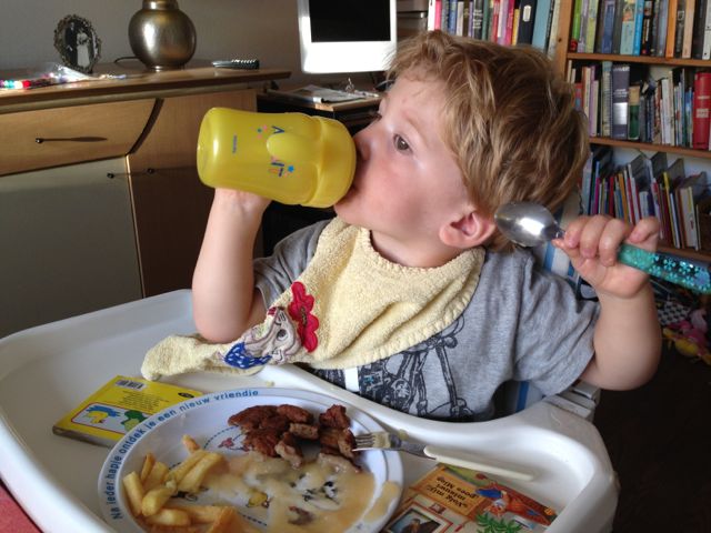 We hebben er patat en hamburger gegeten met APPELMOES. Dat is lekker en daarna nog yoghurt ook.