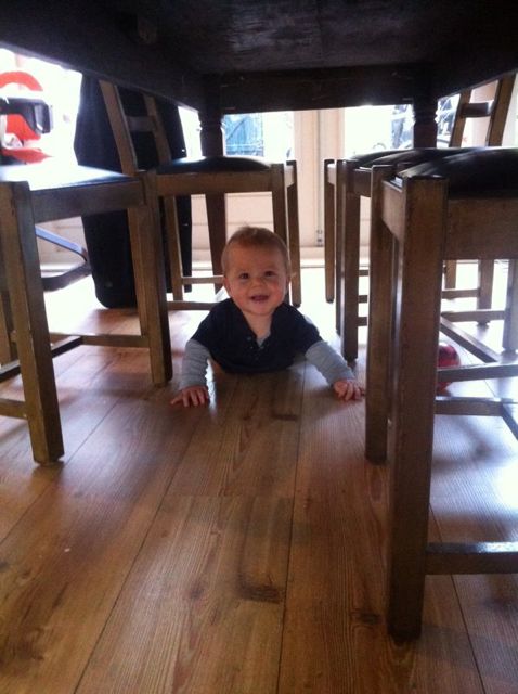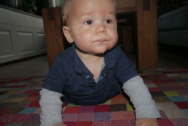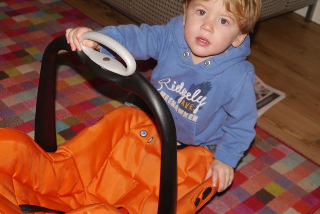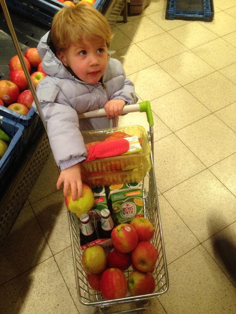 We waren ook nog even gaan boodschappen, papa en ik. En op een onbewaakt moment heb ik het wagentje volgeladen met appels. Ik dacht dat we die nodig hadden…. Papa dacht van niet dus nadat hij een foto heeft gemaakt, laadde hij ze uit en ik vond dat NIET LEUK en ging brullen. Totdat papa me op m’n rug op de wagen legde in ik stokstijf omhoog keek… Dat was het. Appels vergeten en de hardnekkige gedachte in mijn hoofd: Hoe kom ik hier af.