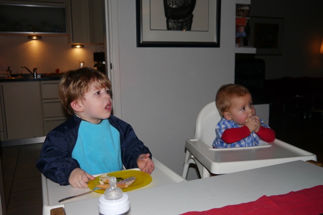 Dzjez wordt trouwens goed om de tuin geleid door papa. Dzjez wil worst, maar krijgt boerenkool op de lepel, afgedekt met een klein stukje worst…. En hij eet alles op! Goeie truc.