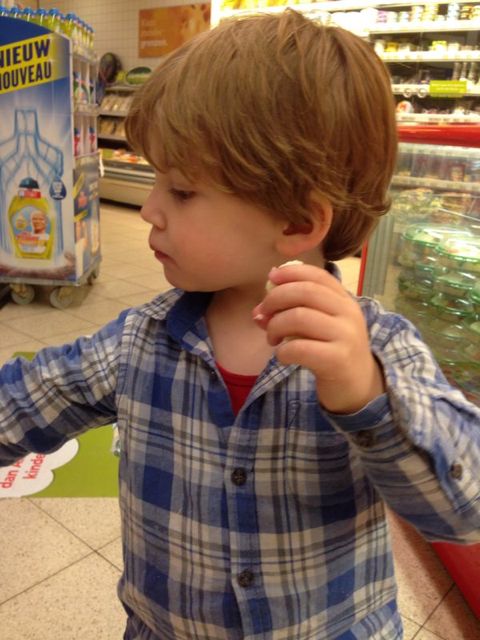 Ten derde ben ik nog even met papa naar de winkel geweest toen ik met mama en Jay terug uit de crèche kwam. Ik met kleine winkelkar en die enorme berg bananen op de grond was wel heel raar! En die meneer zij dat het weg ging, naar de apen. En papa zei: Zonde! En die meneer zei ja en gaf mij vervolgens een gratis banaan. To be a monkey or not to be, ik eet de benaan in 3 happen op. Bolle wangen en een blij gezicht.