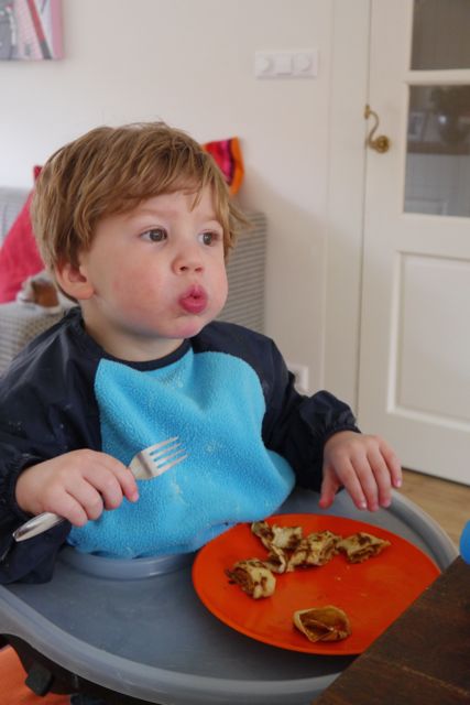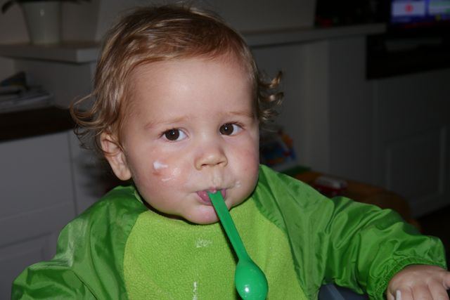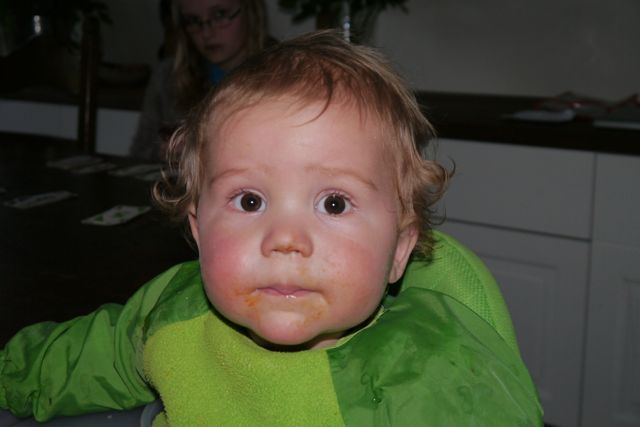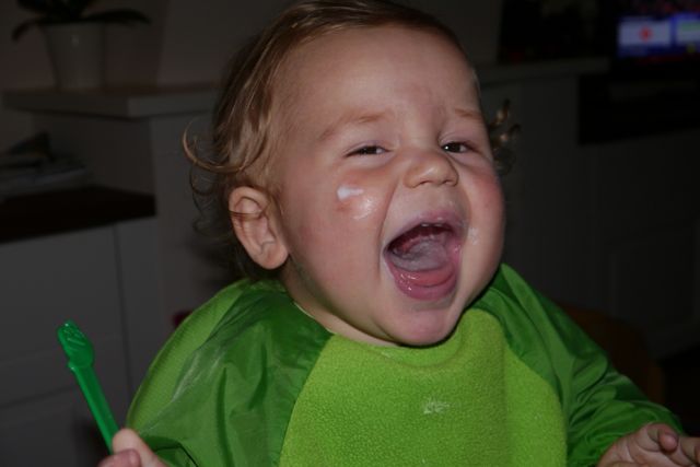 Mama zegt nu ook: Hapje, en ik neem een hapje, want ja ik wil wel Teletubbies kijken, en … het was MMMMMMMMM! Ik nam daarna zelf nog een hap en nog één en ik heb het niet allemaal opgegeten, maar vond het lekker.