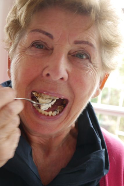 Mij zie je op de achtergrond terwijl ik yoghurt eet! Ik heb al gegeten en het was zo’n dag die je doorkomt met een gevoel dat balanceert tussen zwemmen in stroop en vloeibaar water. De ene keer gaat het moeizaam en zwaar en de andere keer licht en fruitig. Meestal fruitig gelukkig. Niet te veel geslapen, niet te veel gegeten, maar meer dan voldoende gelachen!