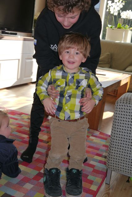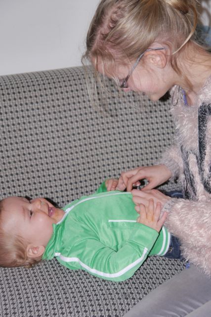 Ik kan al een beetje staan! Echt waar, op een moment dat niemand het verwacht, ben ik in staat om op eigen benen te staan (met hulp van een paar handen onder mijn oksels) en het voelt goed. Wiebelend, een beetje, maar de wereld ziet er anders uit. Dzjez omhelst me dan, ook omdat hij blij is.