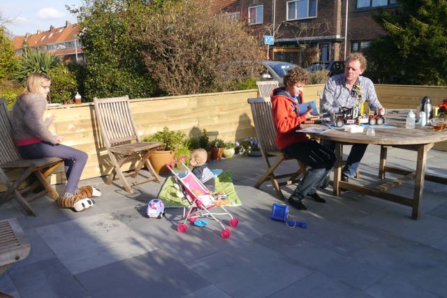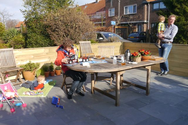 Trouwens, ik ben blij dat we de tuin aan de voorkant ‘gesloopt’ hebben en er mooie tegels hebben neergelegd en de tafel van bij Pake en de stoelen, want nu kunnen we lekker in de zon zitten! En er zit een hek omheen, dus kan ik er niet uit en dat is handig (voor papa en mama, alhoewel ik wel weet hoe de deur open moet hoor, maar ik doe het gewoon niet zodat zij gerust zijn) want dan kan ik met de auto rijden en vegen en opruimen. Belangrijke zaken dus.