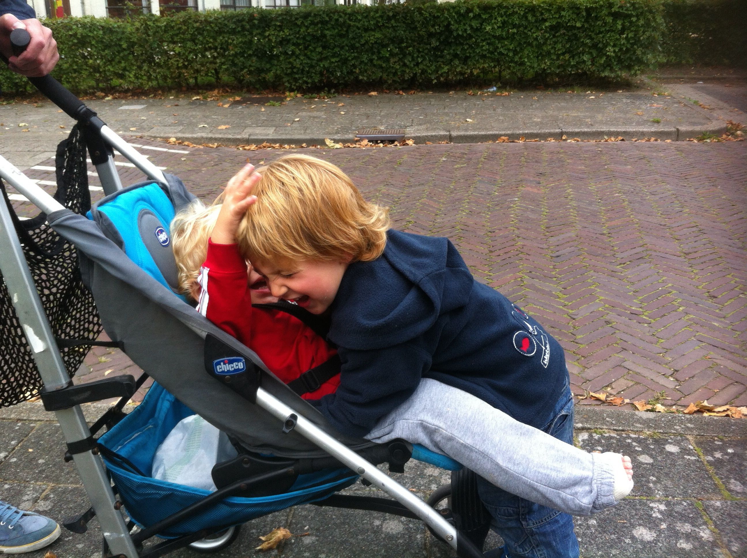 En niet als ik niet mee mag naar de speeltuin omdat het regent en mijn gips anders nat wordt! En ook niet als papa mijn haar wast met de douche, want dan gil ik als een speenvarken. NIET LEUK! Rustig word ik dan weer bij mama op schoot.