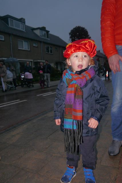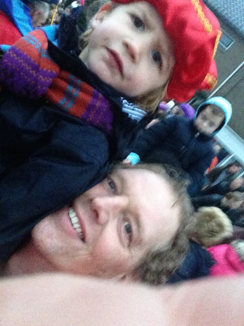 Daardoor konden we wachten en blijven staan en na veel wagens en zwarte Pieten en zakjes pepernoten, kwam daar uiteindelijk Sinterklaas. Eerst op zijn paard, maar dat paard ging bokken (knap hè), waardoor Sinterklaas moest lopen. Prima! Ik heb mijn schouder uit mijn kom gezwaaid en dat was dat. Toen zijn we naar huis gegaan en ik was eigenlijk van dat moment af een beetje half. Warm, vlekkerig en vooral niet hongerig en vroeg naar bed!