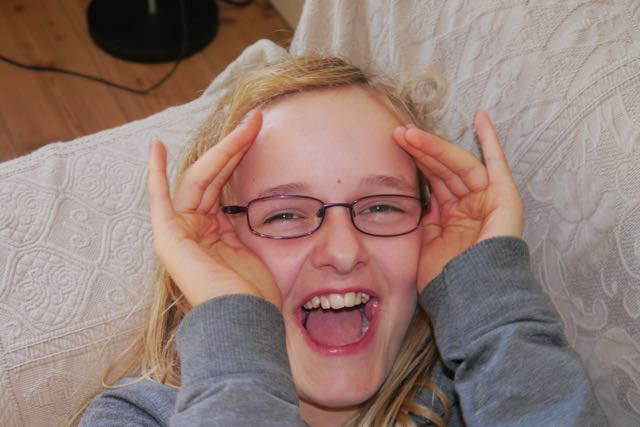 En ik vind het leuk om grappig te doen ook, want ik weet dat mensen dan gaan lachen en dat vind ik fijn. Daarom zet ik een te klein brilletje op mijn grote hoofd en dat staat heel grappig! Vind ik.