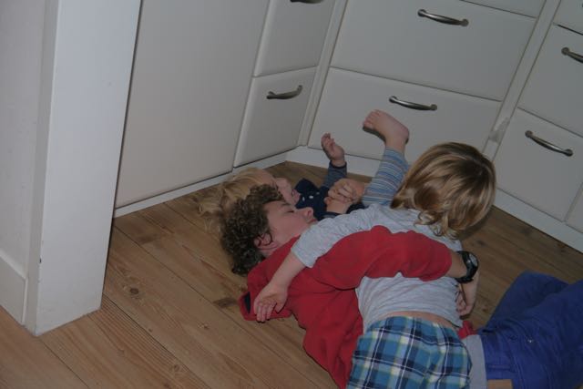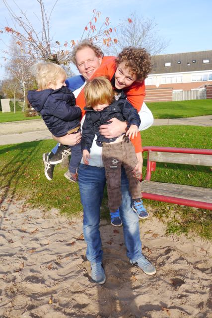 Sommige papa’s doen dat ook. In ieder geval in het leven staan. Met 3 zonen om zijn nek. Nu kan het nog praatjesmaker! Denk ik dan, want straks zak je met ons drieën door de grond. Letterlijk dan hè, want dan zijn we samen wel duizend kilo!