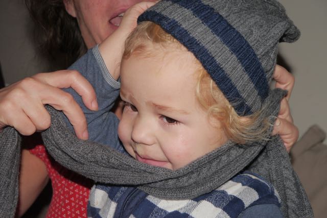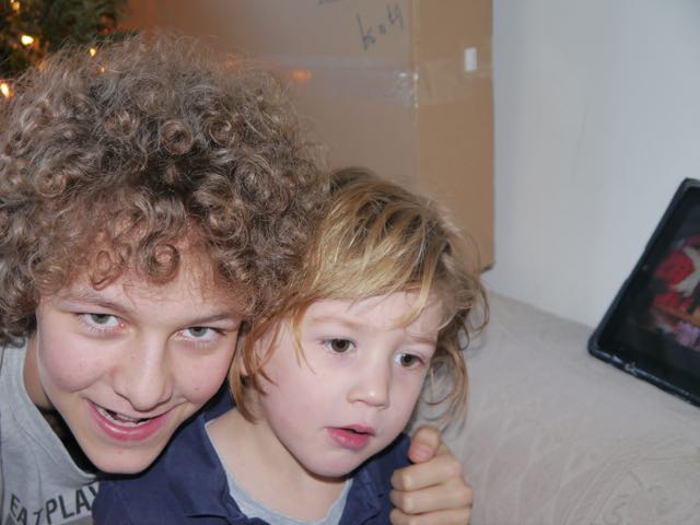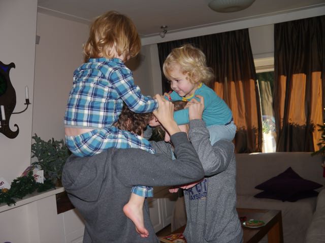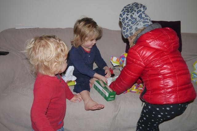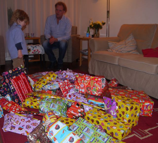 En wat schetst mijn verbazing? Allemaal jute zakken! Nou ja, is daar al die drukte om te doen? Maar goed, ik heb meegeholpen de boel naar binnen te slepen en wat blijkt? Die zakken zitten dus VOL MET CADEAU’S!! Echt waar! Te veel om op te noemen. Nu snap ik de uitdrukking ‘ogen in de achterkant van je hoofd hebben’ . Dat is nodig om alles te kunnen zien.