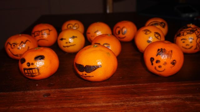 Dinsdag mocht ik trakteren, maar ik heb gewacht totdat Jay terug was. Mandarijnen. Niet zomaar Mandarijnen, maar mandarijnen met een gezichtje. Allemaal met hun eigen identiteit (en geen identiteitscrisis).