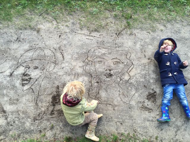 En papa had ook nog een tekening in het bospad gemaakt. Vergankelijke kunst, noemen we dat, want één regenbui en het is weg en misschien is dat maar goed ook.