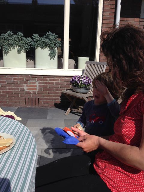 Een andere belangrijk thema van deze week is moederdag. Op de crèche leren ze ons duidelijk geduldig zijn, want we kregen dinsdag al het zelfgemaakte cadeau mee, maar dan moet je dus nog tot zondag wachten! Wat een drama. Dan kom je er achter dat wachten soms zo lang duurt, dat je vergeet waarom je ook al weer aan het wachten was. Maar vandaag is het zo ver! We mogen eindelijk ons zelfgemaakt cadeau geven! Een theekan met een echt zakje thee. En Jay had ook thee, maar had het zelf al vast uitgepakt! Handig!