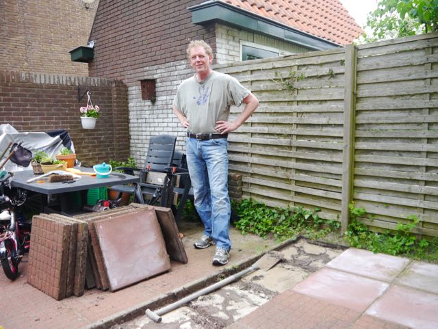 Papa had ook een mooie uitdaging: het achterterras aanpassen. Wat dat precies inhoudt is mij niet geheel duidelijk, maar wat je er mee kunt des te meer. In het lichte en donkere zand spelen. Ik had de hele middag lekker geslapen (en als ik dan wakker wordt, zit ik vervolgens met gemak nog een uur in mijn eentje te kletsen en te spelen) en kon dus direct in mijn pyjama door naar buiten. Dat vonden mijn blote voetjes ook fijn, want ze hielden de modder goed vast. Ik vind dat leuk!