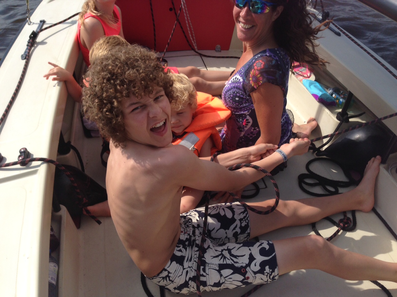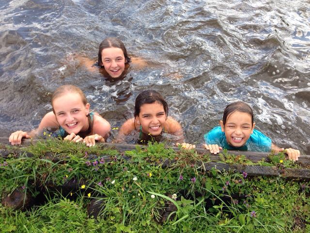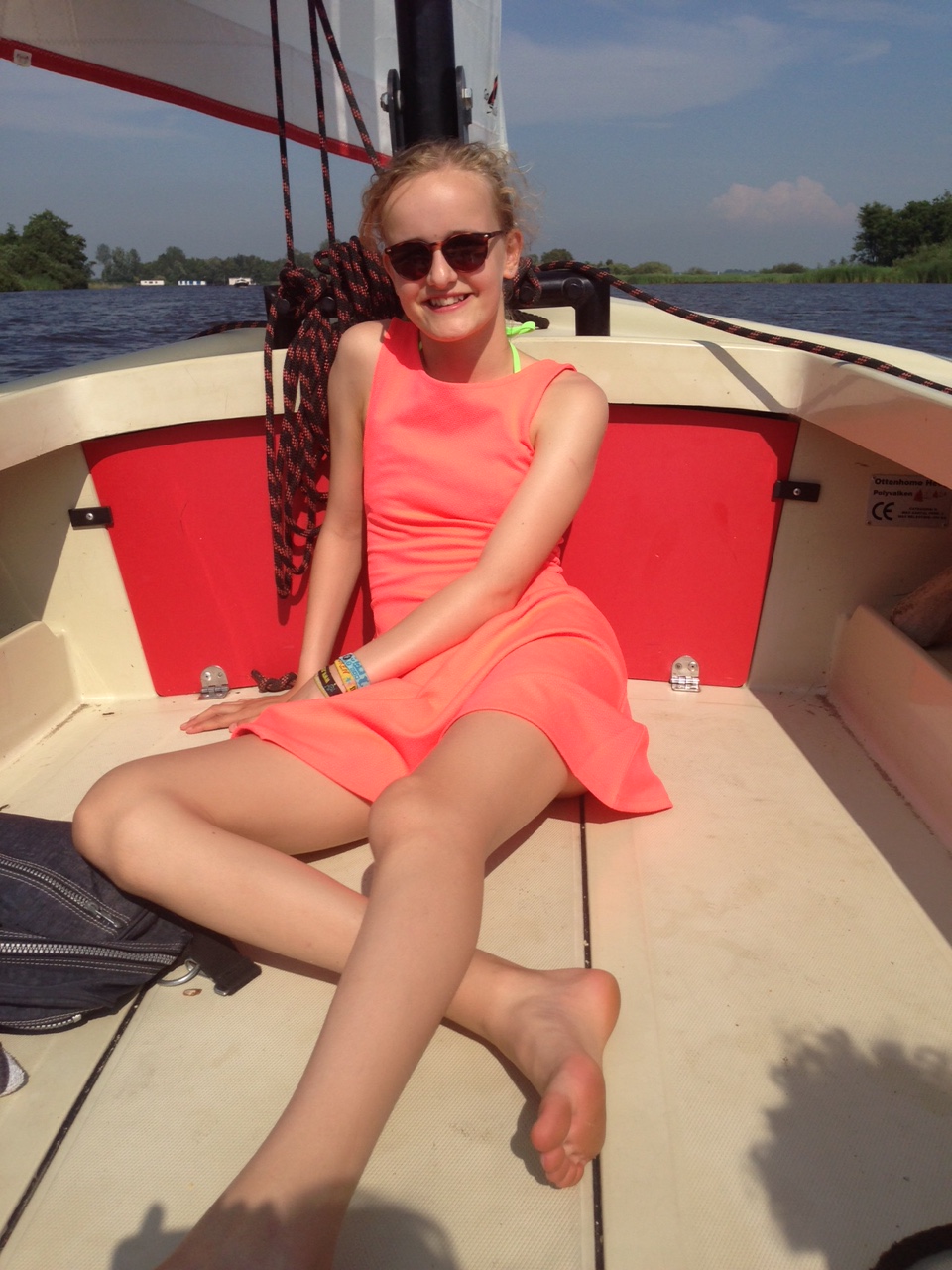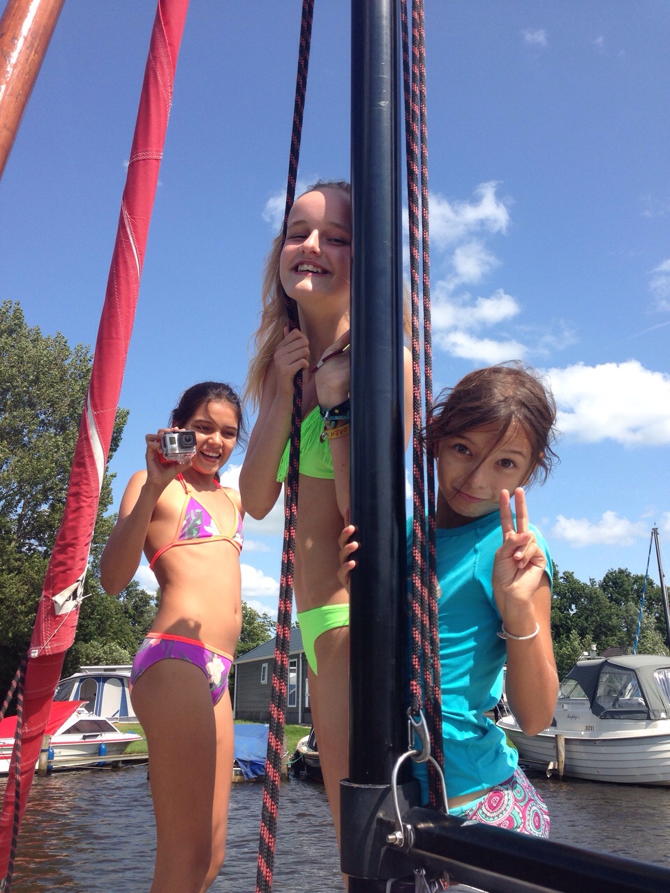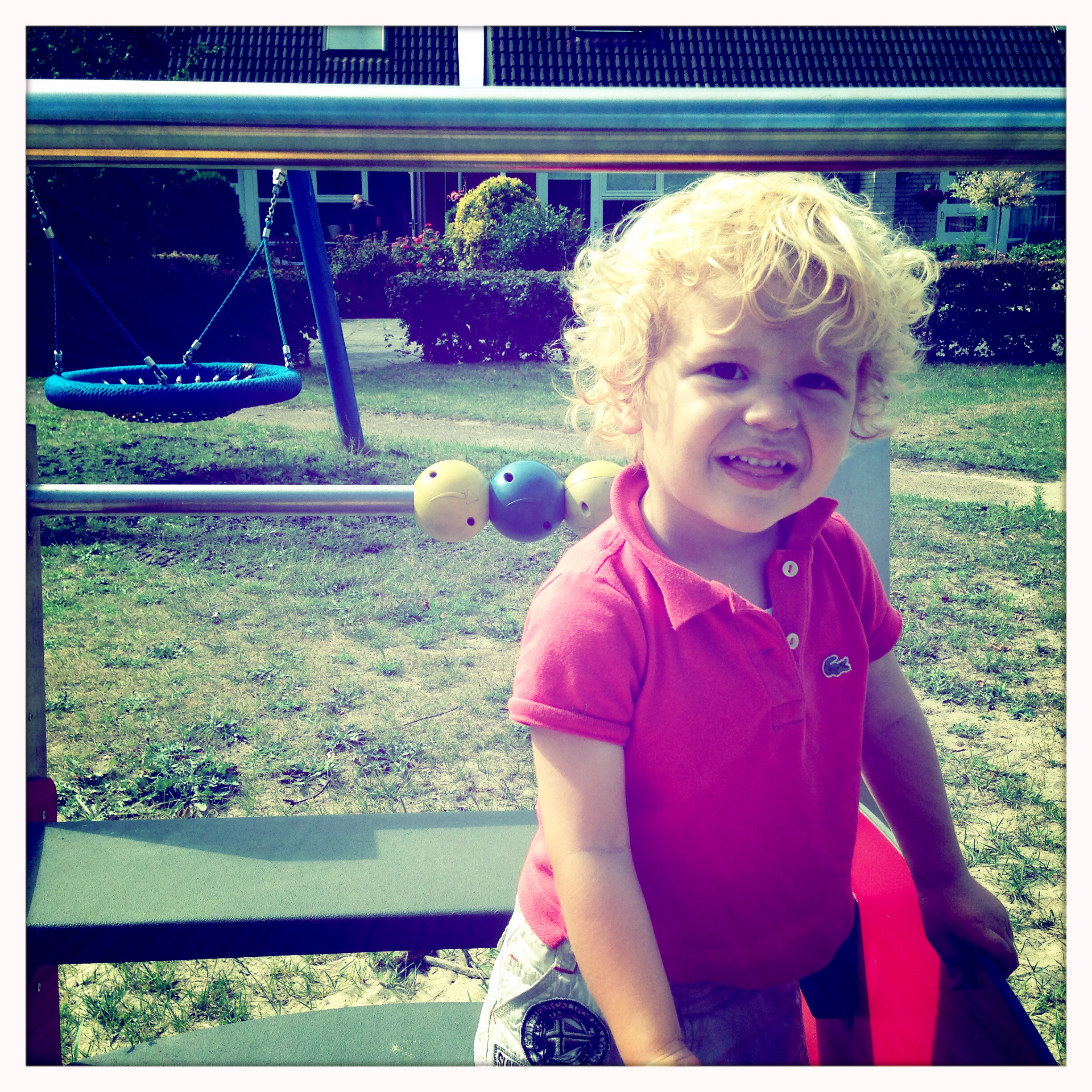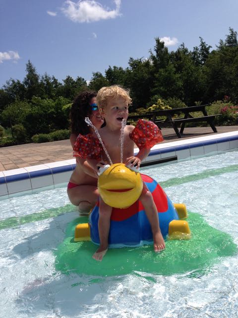 Papa zet de glijbaan er half in en daar waar Dzjez in staat is zijn glij-baan te controleren en het daarmee voor elkaar krijgt niet nat te worden, lukt mij dat niet. Ik glij i volle vaart verder in het zwembad en sta letterlijk op het punt onder te dompelen in 21 centimeter water. Gelukkig besef ik me net op tijd dat het grootste deel van mijn lichaam boven water is en ik alleen maar op hoef te staan. Pffff