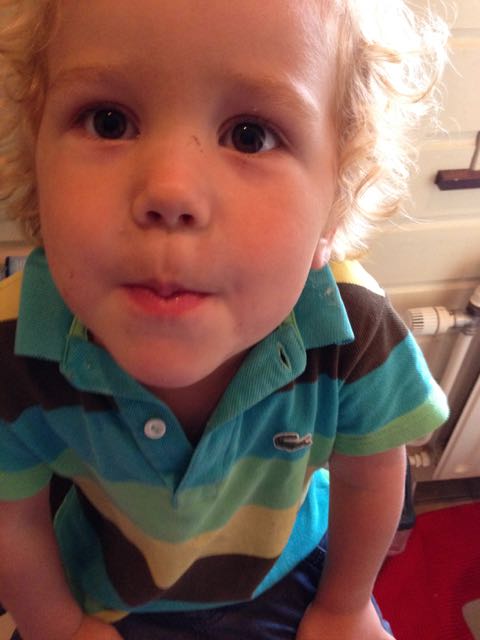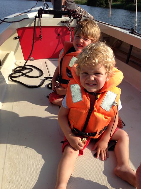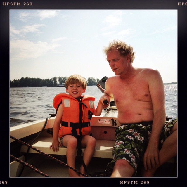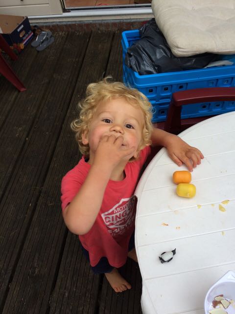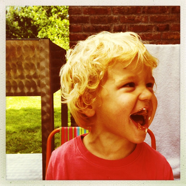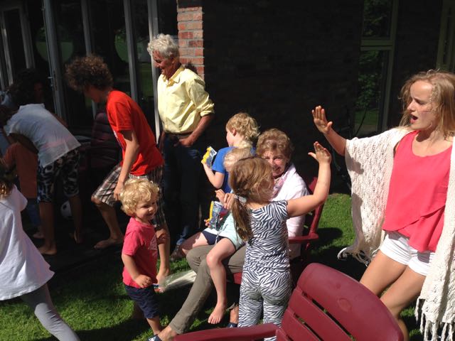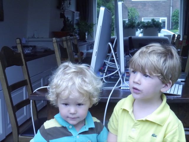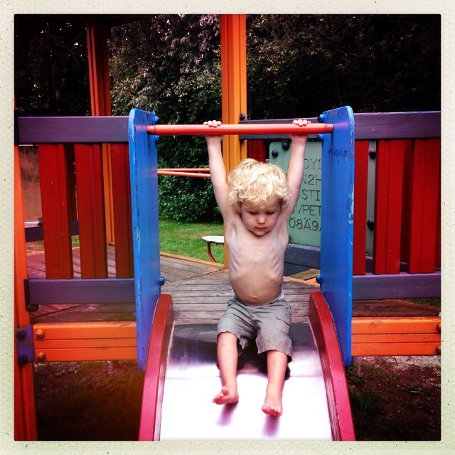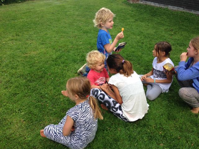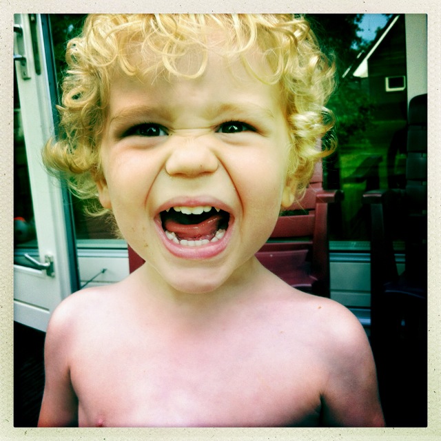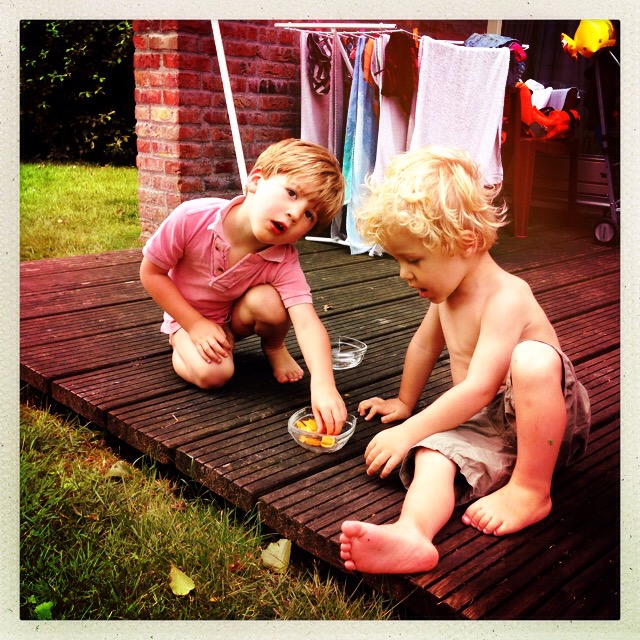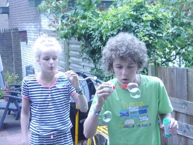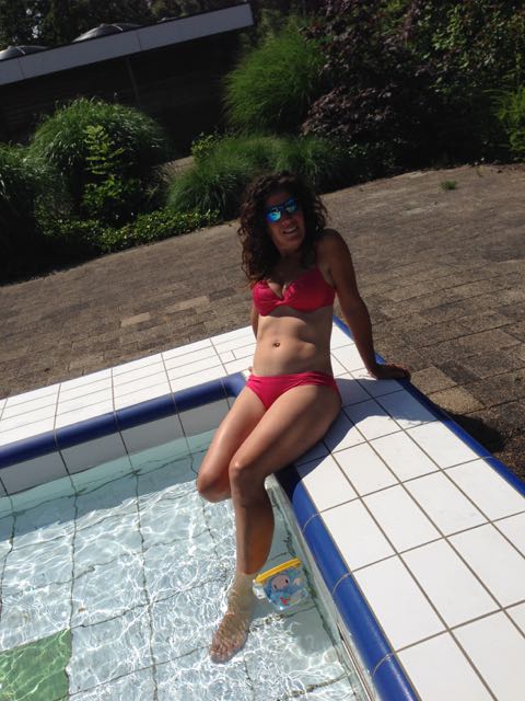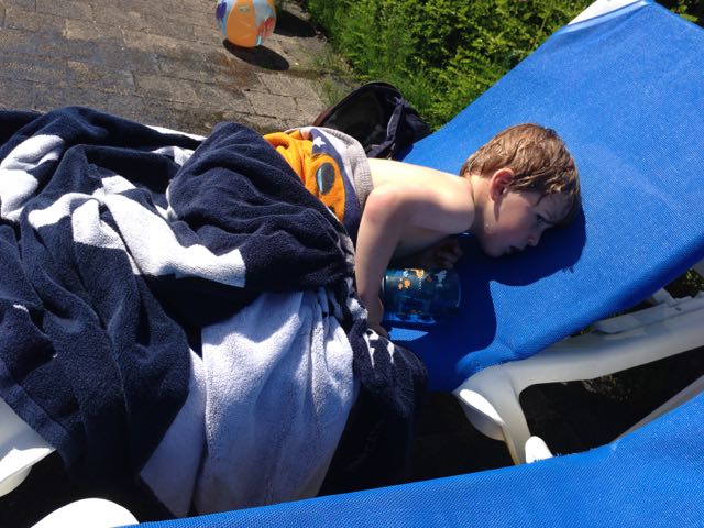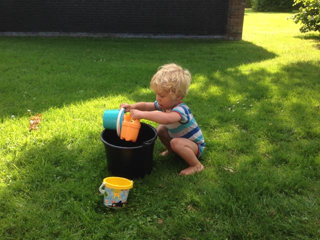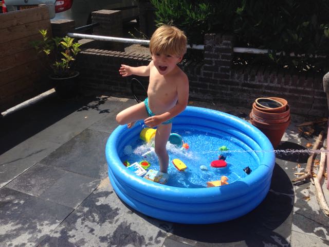 Zodra we thuis zijn komt papa het badje op met een ingenieus apparaat dat met veel gepuf en geblaas de randen van het badje op pompt. Een mooi fenomeen, een ontwakende zwembad. Daarna gaat de tuinslang door het huis (en wordt dus tijdelijk gepromoveerd tot huisslang) en wordt via de spijlen van de tuinstoel op het badje gericht. Spectaculair met veel spetters. Dan snel het speelgoed er in in en wij. Wij die er heldhaftig tot aan de onderkant van onze enkeltjes instaan en heel hard “KOUD!” roepen. Ik ben een angsthaas en steek Jay een beetje aan. Als we later groot zijn, hebben we dat niet meer!