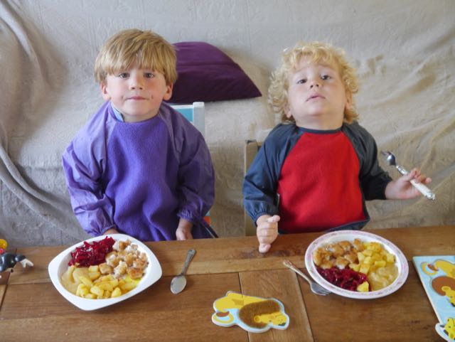 Als ze weer weg zijn, gaan we eten. Gebakken aardappeltjes, vissticks, appelmoes en rode bieten en dat is superlekker, zeker als jet het voor de televisie mag opeten. Ik, de tafel en de vloer zaten er dan ook onder. Volgende keer misschien weer in de stoel aan de gewone tafel.