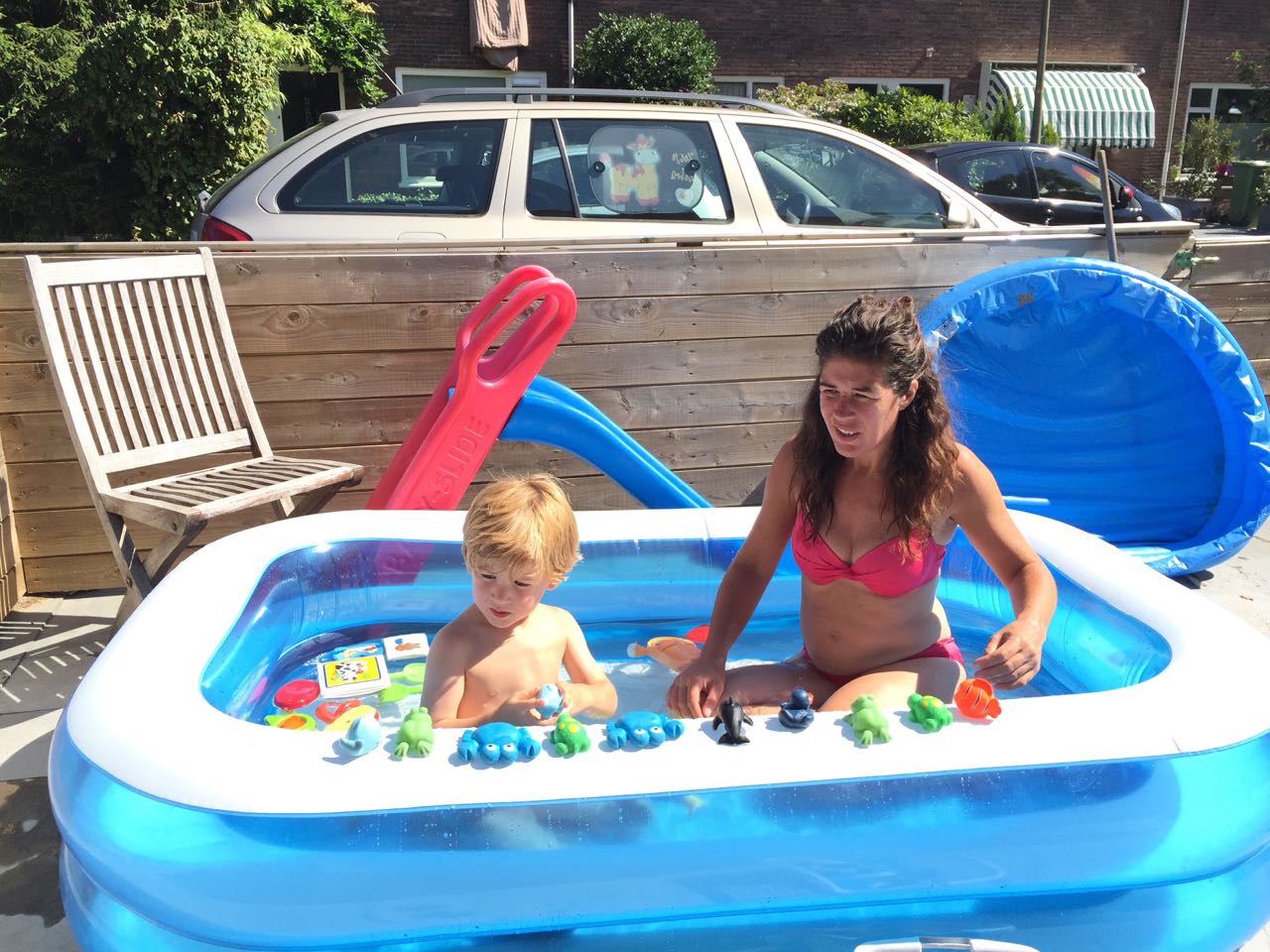 Nou, dat betekende samen in het zwembad met gezellige speelgoedjes. Dat zijn kansen die je niet moet laten schieten. Heerlijk, wij-tijd, mama en ik. Ik zit in een fase waarin ik alle aandacht fijn vind, maar dit is het helemaal.