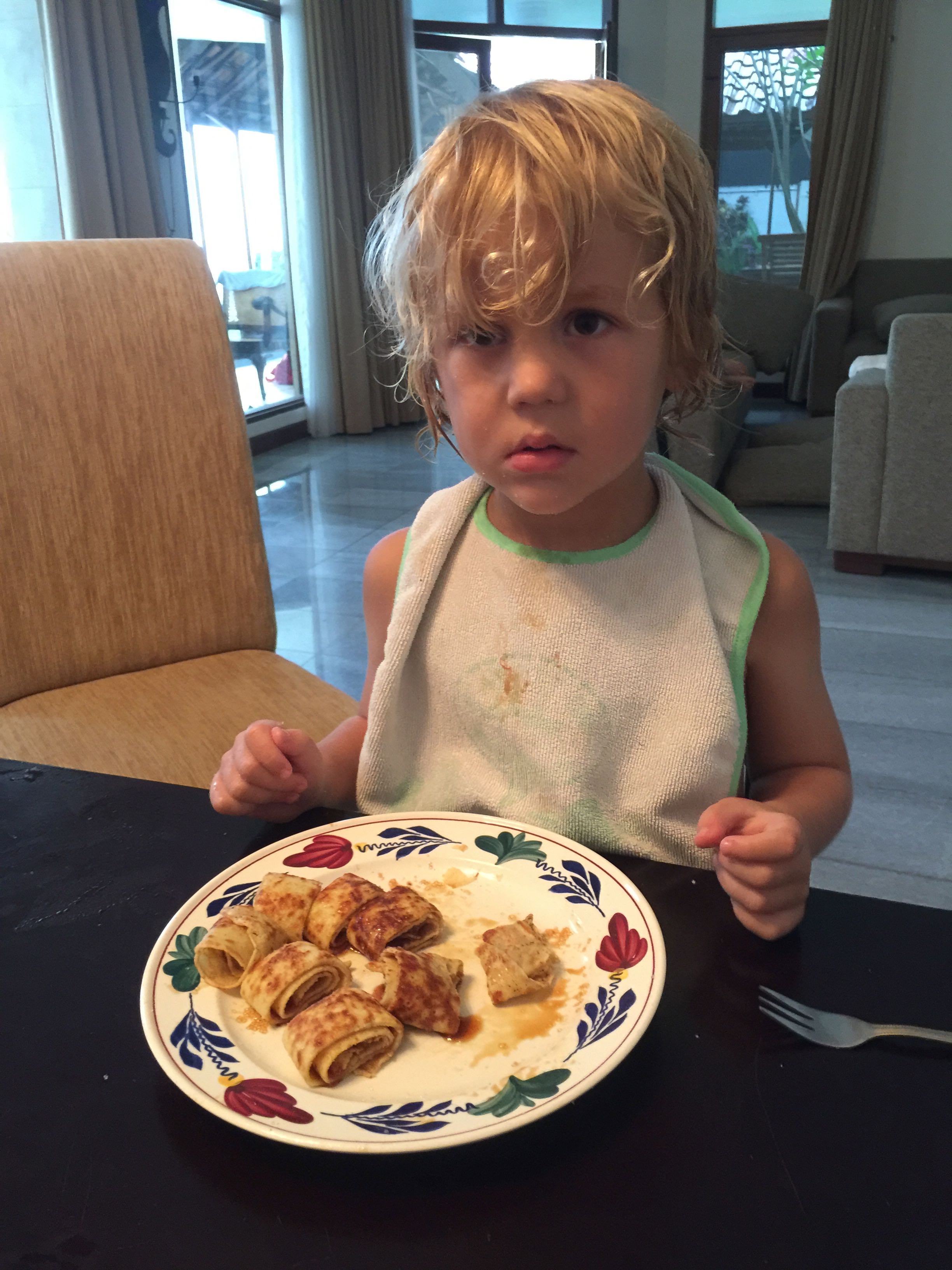 Na een bad/douche sessie en papa die ging hardlopen, was het zover. Ik heb 4 pannenkoeken gegeten, terwijl Dzjez al afhaakte bij 2. Als ik zo doorga ben ik straks twee keer Dzjez.