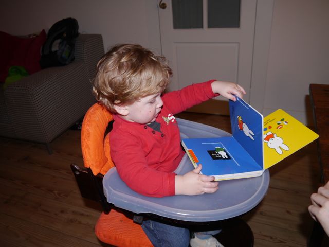 Mama had een krant gekocht en kon lekker aan de grote tafel zitten. Ik kom dan zo nu en dan even dag zeggen en ga dan weer weg en ga Zelda dag zeggen. Super. Of ik lees zelf mee, want dat kan ik ook. In mijn Nijntje-boekje. Totdat ik er geen zin meer in heb. Dan gooi ik het weg.