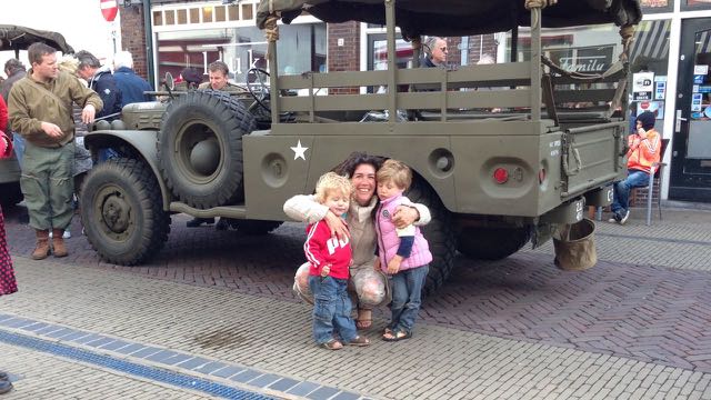 Na de muziek hebben we een echte wandeling gemaakt over de wallen van de vesting. Ik hobbelend in de buggy en de wind in de haren! Toen we terug in de bewoonde wereld waren, hoorden we dat er een optocht kwam van hele oude tweedewereldoorlog auto’s en die zijn dus allemaal groen!