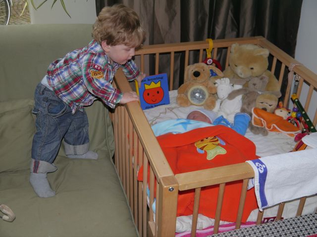 Zij heeft een bed voor haar babybjorn gekregen en nadat papa die in elkaar heeft gezet, hebben we daar mee gespeeld. Een bed geeft een nieuwe dimensie, want dat geeft aan dat je naast de poppenwagen dat dus ook kunt doen met een pop. Ik bedoel maar.