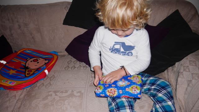 Maar, de eerste dingen eerst. Opstaan en naar beneden en wat denk je? Er zijn cadeaus. Eén voor mij en één voor Jay.