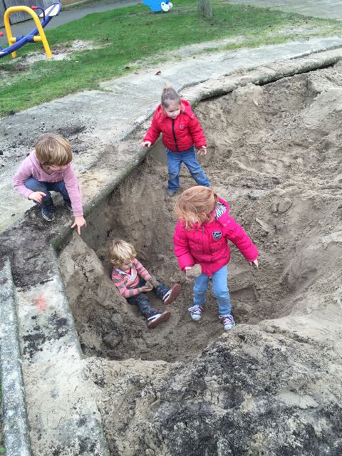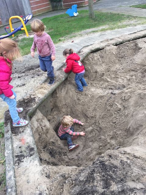 Als Papa en Siebe gaan Volleypongen (Siebe heeft gewonnen), gaan wij naar de ‘andere’ speeltuin. Daar ontdekken we een heel groot gat! Dat is mooi en spannend spelen. Jay zit in now-time onder zand en modder, maar met de grootste lach die je maar kunt verzinnen op zijn gezicht.