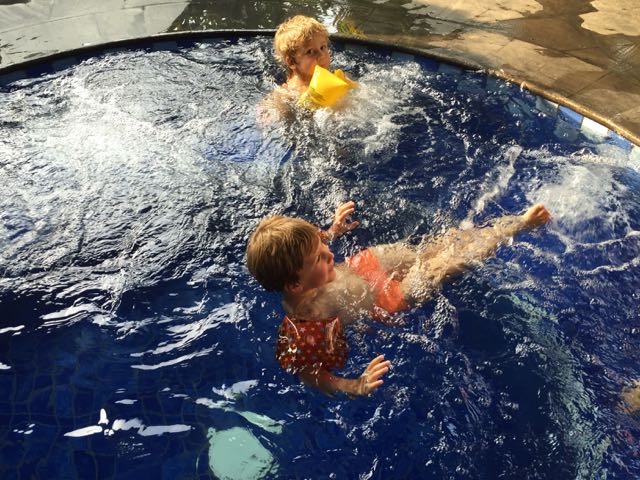 Ik was dan weer zo moe van de film en alle indrukken (inclusief die van Dzjez in het zand) dat ik bij mama in het zwembad in slaap viel. Gelukkig was ik maar heel even heel chagrijnig toen ik wakker werd….