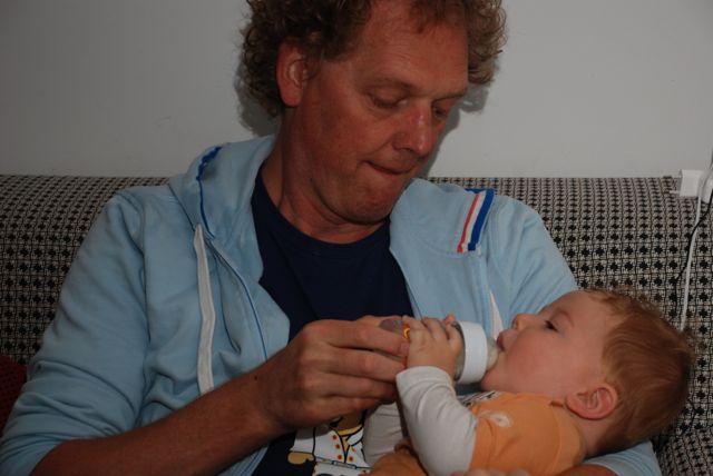 Papa heeft me al grappenmakend met zo weinig mogelijk gepiep en naar verhouding best veel gelach omgekleed, maar toen mama boven kwam met het flesje had ik vooral aandacht voor haar!